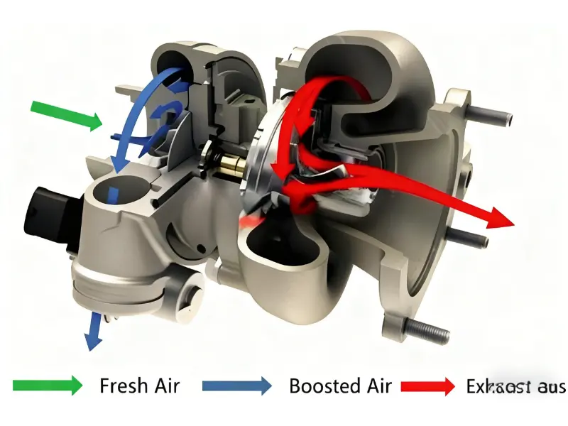 Một bộ tăng áp có hai phần chính: tua bin và máy nén.